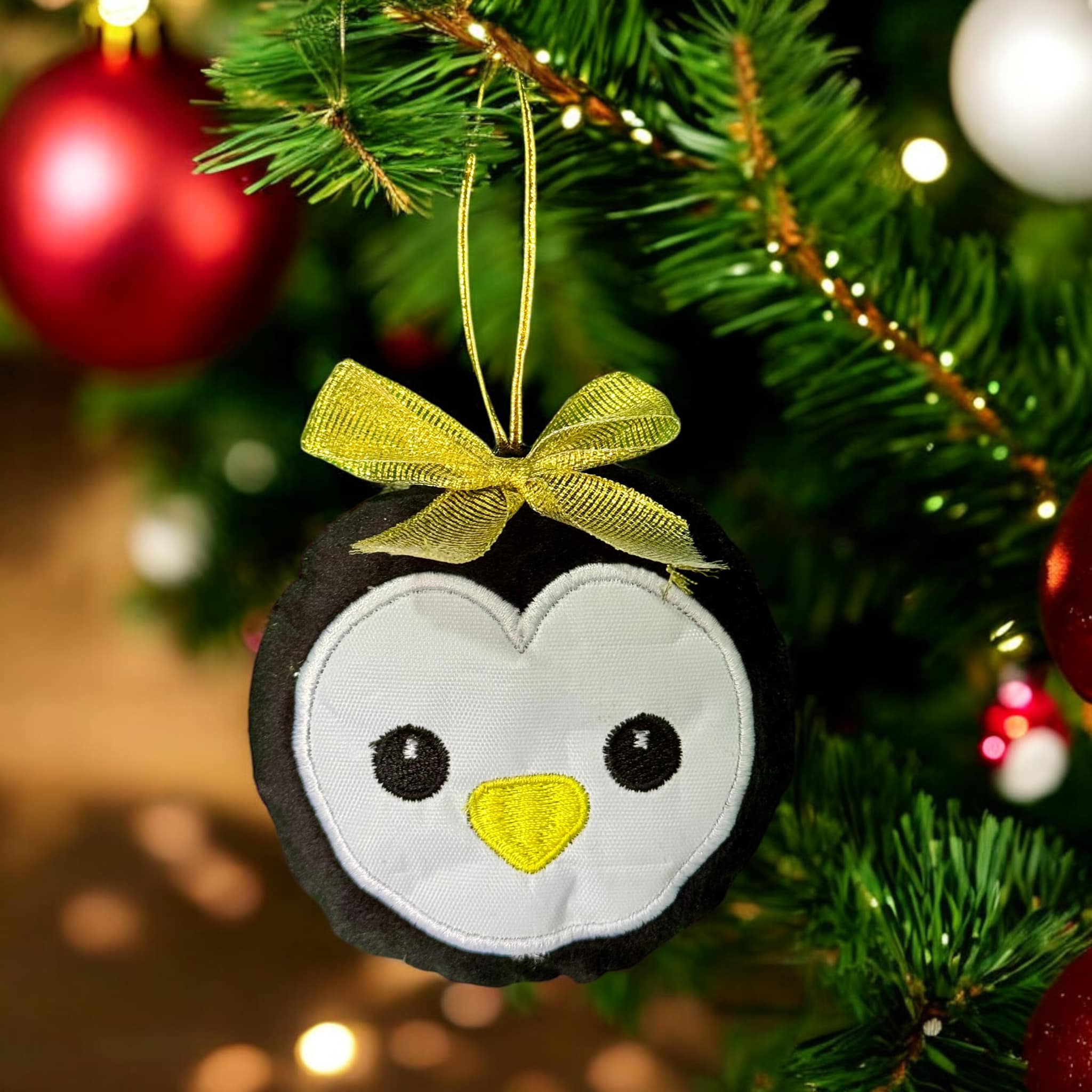 Esfera de peluche para adornar tu árbol navideño con forma de pingüino